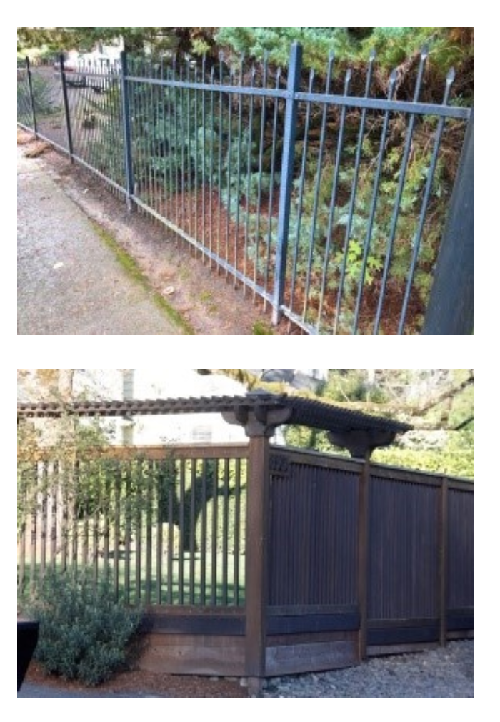 2. An exception may be made for a small fence run attached to and in front of an existing fence that is specifically designed to hide the garbage, recycling and garden waste cans. It will meet all requirements in the section: General Requirements for All Fences and Gates. It will have an access gate and will be sized such that it hides the aforementioned cans (a minimum four (4) feet high and a maximum four (4) feet out from the existing fence) and link into an existing walkway. It will not obscure any street sight lines.