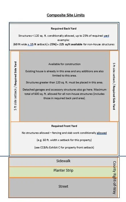 Setbacks: A setback is the distance from the property line within which building certain structures is prohibited by either Washington County or the Association. Reasons for having a setback include aesthetics, safety, and emergency/utility access.