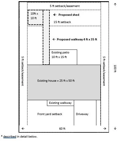 If you’re submitting a permit application that requires a site plan (e.g. fencing, sheds, patios, etc.), you’ll need to know where your property lines* are, as well as how to identify setbacks* and easements*. Please draw to scale, showing property dimensions, setbacks, existing structures, patios, walkways, etc., as well as indicating proposed structures on your permit application (marking dimensions on a satellite map is often effective, as long as tree canopy does not hide/mask the view).