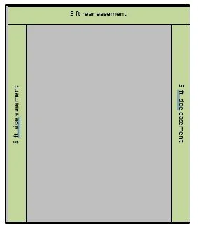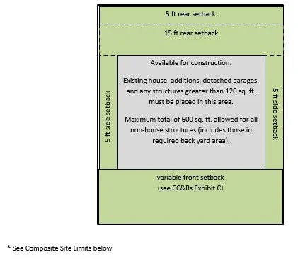 Rear setbacks: 5 ft for small items (sheds, decks, etc.) and 15 ft for large items (large sheds, house additions, etc.) which defines the Required Back Yard*.